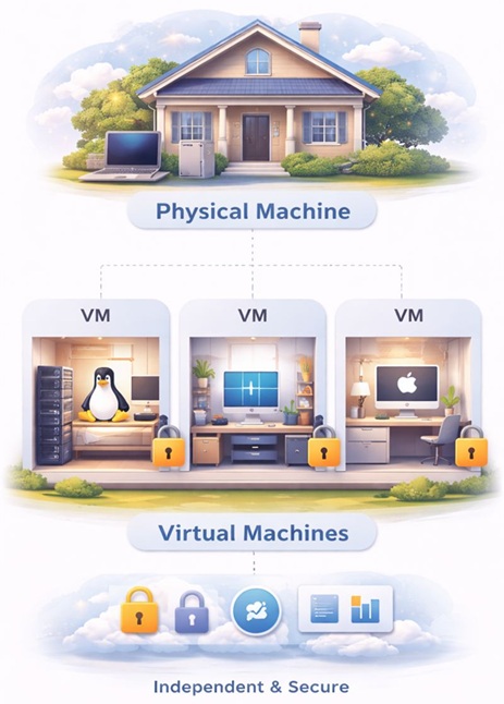 🧍 Virtual Machines = Separate rooms inside the house
