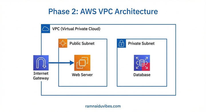 - Task: This is the hardest part for beginners. Learn to create a VPC, Subnets (Public/Private), Internet Gateway, and Route Tables.